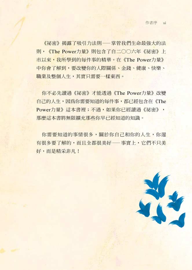 《祕密》的吸引力法則改變了我與上千萬人的一生,現在《The Power力量》則是把《祕密》背後的祕密說得更清楚。「愛的法則」將我們直接帶到創造幸福的源頭,這是2011年全人類必須立即學會的議題,如此我們就有一個非常精采美好的2012!