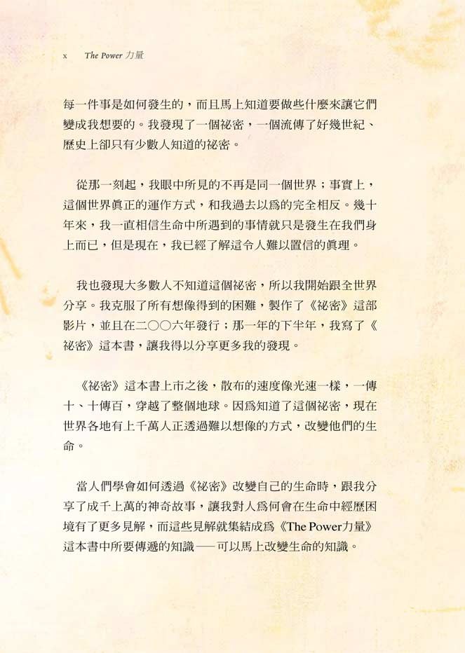 我讀過《祕密》,而且非常喜歡,也試著在生活中實踐書裡提到的那些道理,而《The Power力量》把那些道理和方法說得更明確,見解更深刻。