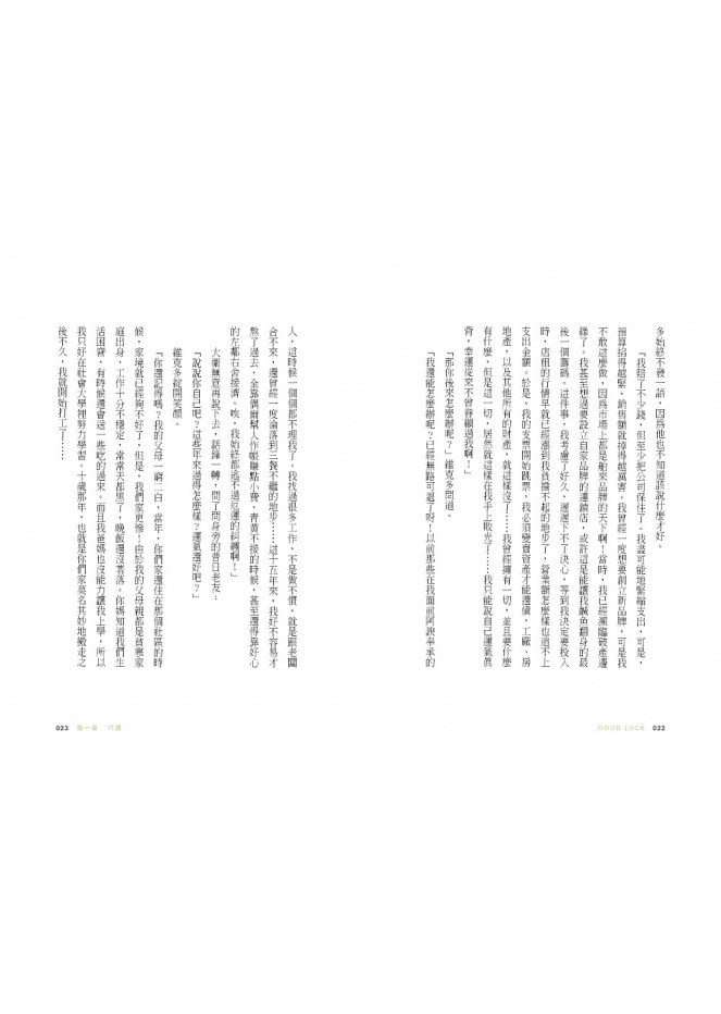「這麼說吧!運氣確實是存在的,只是,你若以為它會憑空而降的話,那你就大錯特錯了!即使哪天運氣真的上門了,不過是稍縱即逝罷了,不可能持續太久的。你知道嗎?近九成的樂透中獎者,不出十年光景,就會花光所有獎金,並且再度回到沒有中獎前的狀態。反觀『幸運』,無論何時何地,你自己就能為自己帶來好運,所以我們才稱之為『幸運』嘛!因為有幸才得以擁有好運,真正的好運啊!」