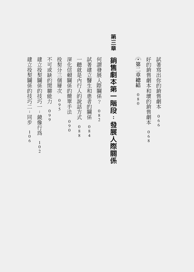 在書中,作者完整分享他獨創的這套業務心法,帶你走過提升成交率的五大階段,並以大量對話範例告訴你如何掌握客戶心理、發掘需求,製作出屬於你的有效銷售劇本,改變你的業務人生。