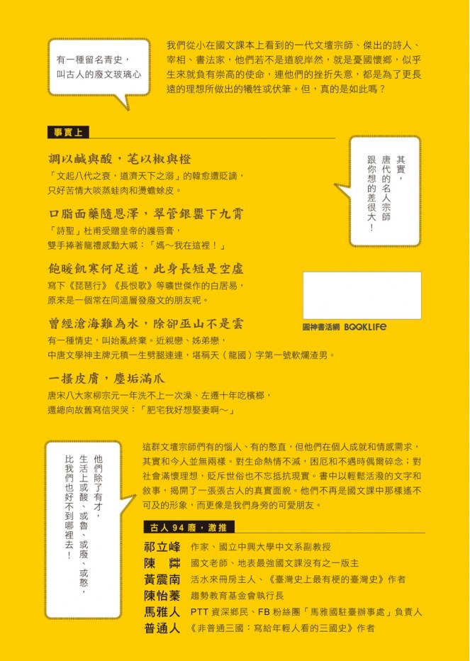 這群文壇宗師們有的惱人、有的憨直,但他們在個人成就和情感需求,其實和今人並無兩樣。對生命熱情不減,困厄和不遇時偶爾碎念;對社會滿懷理想,貶斥世俗也不忘抵抗現實。書中以輕鬆活潑的文字和敘事,揭開了一張張古人的真實面貌。他們不再是國文課中那樣遙不可及的形象,而更像是我們身旁的可愛朋友。