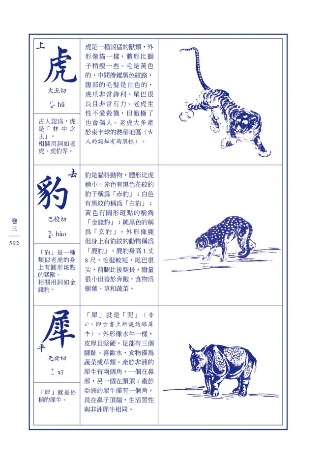 眾所周知,如今通行的注音方法是注音符號及漢語拼音,但古書所用的注音方法則包括直音法、反切法等,本書根據需要將直音改為注音和漢語拼音,而切音則作為一種語言現象完全保留下來,放在例字之下。釋義中出現的生僻字或複雜字,我們全部標注讀音即基本涵義,使閱讀更加順暢。如卷一「藪(音ㄙㄡˇ)」,卷三「郁鬯(音ㄩˋ ㄔㄤˋ)」等。 本次編譯盡可能保留原著例字與插圖,只是個別漢字寫法有誤,我們都已糾正過來。另外,原著收錄眾多異體字,白話全解版則僅標注《現代漢語詞典》所收字例。釋義中也盡可能保留原字,即便是字庫中缺乏的字例,我們也依據原著重新造了字。