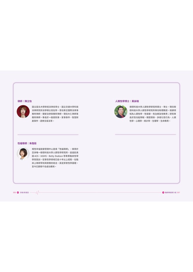 醫師專家群:性健康管理師童嵩珍、泌尿科醫師程威銘、婦產科醫師郭安妮、泌尿科醫師莊豐賓、律師陳立怡、性福導師朱瓊茹、人類性學博士黃詠瑞