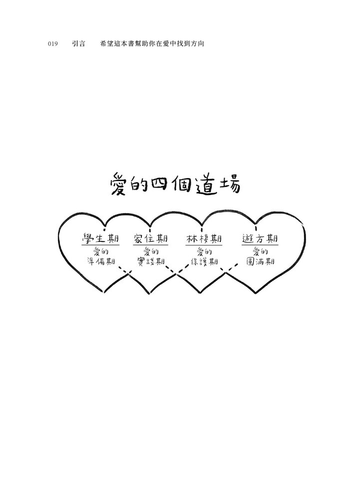本書按照這四個階段的順序展開,本質上,這四個階段也呼應了感情發展的週期—從準備愛、實踐愛、保護愛,到臻於圓滿的愛。