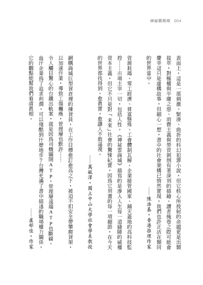「大家好。」她說:「歡迎來到你們的初級住所。相信各位看過住宿資料都知道,房間是可以升級的,但目前就先待在這裡。我們已為各位提供一些基本用品,若還需要其他東西,可以前往商店添購。在母雲的第一個星期,凡是購買住宿與保健用品,都能享九折優惠。之後,只要是在雲集團網站上購物,也都能打九五折。洗手間位在走廊盡頭,分男性、女性與中性。若有任何需要,請找住在『R』號房的舍監。現在請各位放下行李,到處走走,熟悉一下你在雲集團的家人。不過可能得先請大家看一下床上。」她拍拍手。「床上盒子裡有指派的工作,還有相應的制服,在等著你們。」