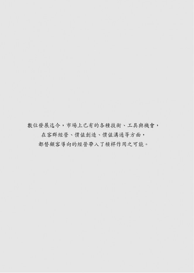 釐清了「短視症」對於企業的致命性,界定了「顧客導向」的企業經營本質,經營者迎向數位新局,還需認得清數位經營「形」與「神」這兩個層次的截然不同之處。臨馬路的牆面上大喇喇放上店名外沒有任何線索的QR code、粉絲專頁拚命利誘衝粉絲數按讚數、耗費資源推出評價2.4顆星的app、「今年開始建置物聯網系統,明年預期因此獲利兩億」、「建造一個符合工業4.0標準的新廠」、「結合大數據,進軍XXX」……迄今檯面上太多既有企業類似的做法或宣稱,徒求彷似數位發展的「形」,卻離數位經營的「神」甚遠。求「形」甚易。市場上多數想像得到的數位發展,其後台技術都找得到第三方已架構好的解決方案。所以無論是短期內為了管理形象、激勵股價,或者單純趕流行,企業要做出些流行的數位樣貌都非常容易。然而,數位經營的「神」,則在於具體掌握各種數位可能,藉以驅動理當是企業經營本質的顧客經營。本書將透過各種「數位槓桿」的討論,梳理出這個意義下數位經營的「神」之所在。