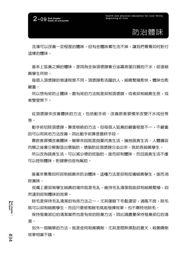 所以,談戀愛其實並不難,只要你預先做好「準備」工夫。本書教你約會前的預習功課,包括外貌清爽乾淨的秘訣、良好體型的鍛鍊、突顯優點的穿著、口臭體味的防制、身上雜毛的處理、頭髮眉型的整理等細節。