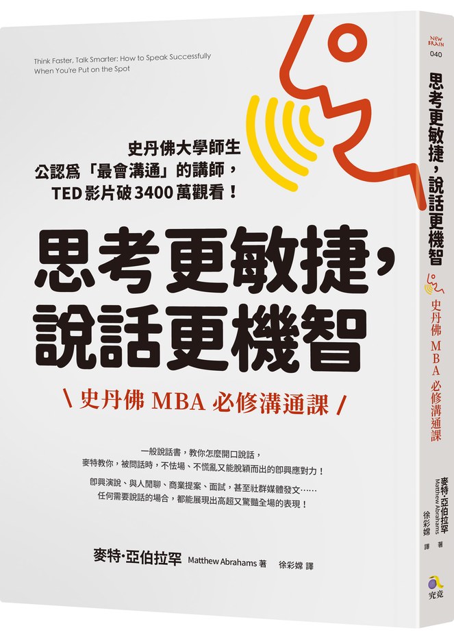 「讀了這本書,你將學會如何在各種對話場合來去自如,同時,這本書還提供了具科學根據的方法,讓你可以學會管控焦慮,並且在任何場合——從工作面試到突如其來的即興問答——都能從容應對,並說出動人的話。專業人士、教師、父母,或任何需要說話的人都非常適合讀這本書。」——查爾斯.杜希格/《紐約時報》得獎記者
