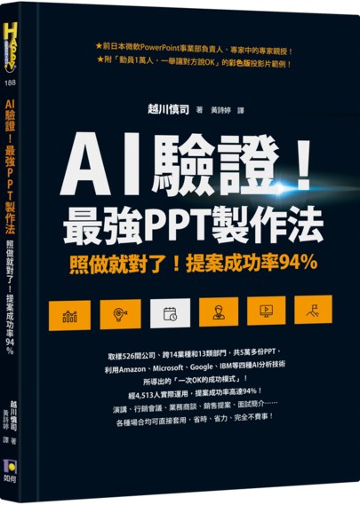 前日本微軟PowerPoint事業部負責人、專家中的專家親授!附「動員1萬人,一舉讓對方說OK」的彩色版投影片範例!你是不是一直搞錯重點了? 熬夜製作精美PPT、嘴巴說得口沫橫飛,但是業績一樣沒起色?如果沒有明確目的就投入工作,絕對無法得到成果。好的簡報只有一個目的,就是「讓對方照你想的來做」!這套PPT成功模式,經過4,513人實際利用,驗證達成率94%!演講、行銷會議、業務商談、銷售提案、面試簡介……各種場合均可直接套用,省時、省力、完全不費事!